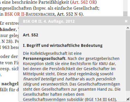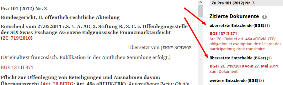 Im rechten Fensterpanel werden Ihnen unter der Überschrift Zitierte Dokumente sämtliche in einem Dokument zitierten Dokumente angezeigt. Zudem erhalten Sie hier – in Abhängigkeit vom Dokumenttyp – weiterführende Referenzen, wie z.B. auf den Original-Entscheid, der in einem Zeitschriftenartikel besprochen oder übersetzt wird. Unter der Überschrift Verwandte Dokumente erhalten Sie sämtliche Dokumente, die entweder das Dokument selbst zitieren oder ein verwandtes Dokument, wie z.B. den entsprechenden Gesetzesartikel zu einer Kommentierung.